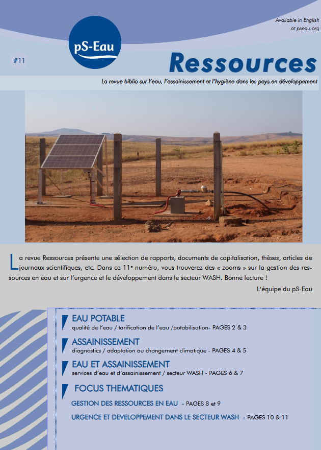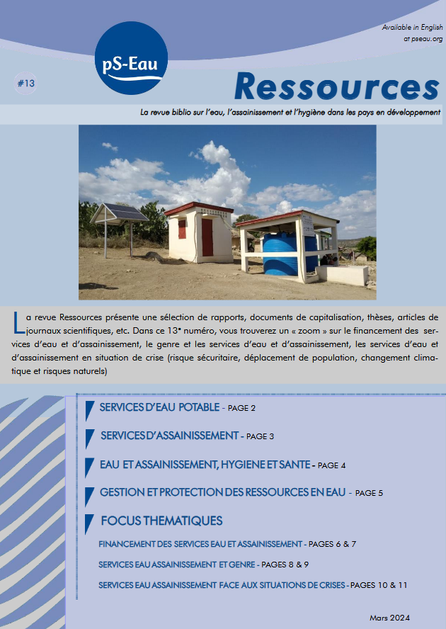 Ce 13ème numéro s’intéresse au financement des services, d’eau et d’assainissement, au genre et les services d’eau et d’assainissement, aux services d’eau et d’assainissement en situation de crise (risque sécuritaire, déplacement de population, changement climatique et risques naturels).