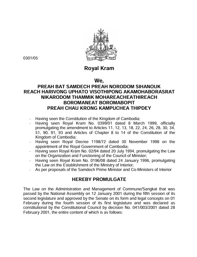 Loi sur la gestion administrative de la commune loi, code, texte réglementaire - 2001 - 20 pp Ed. Kingdom of Cambodia - |
