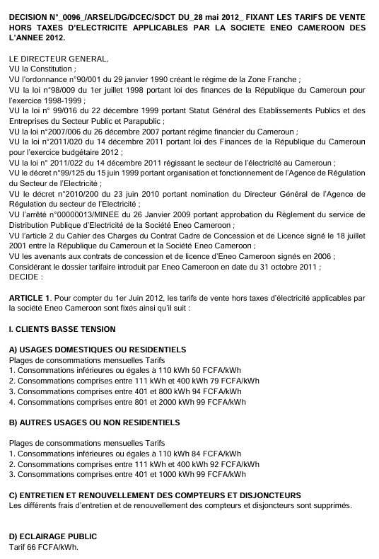 Décision N°_0096_/ARSEL/DG/DCEC/SDCT du_28 mai 2012 fixant les tarifs de vente hors taxes d’électricité applicables par la société ENEO Cameron dès l’année 2012.