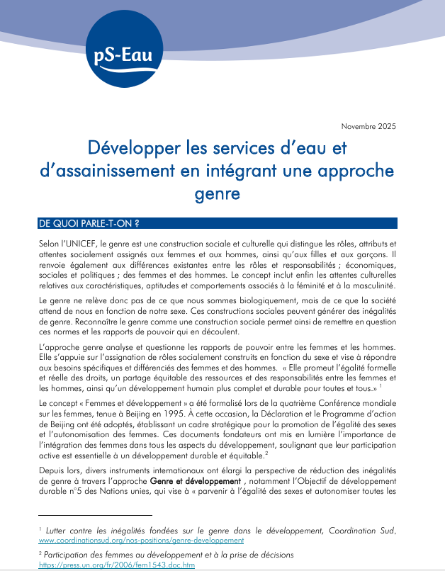 note coll. Fiche de synthèse Jul 2025 ; 10 pages Ed. pS-Eau - Paris Téléchargeable sous format: PdF Résumé: Les femmes sont les principales bénéficiaires des services d’eau et d’assainissement et sont particulièrement vulnérables face au manque d'accès à ces services. Or, elles n'ont que rarement l'opportunité de participer aux décisions. Avoir une approche genre incite à prendre en compte la population usagère dans toute sa diversité et conduit ainsi au développement ou renforcement de services d’eau et d’assainissement plus pertinents et donc plus efficaces et durables en garantissant la prise en compte et la responsabilisation de l’ensemble des personnes usagères et actrices du service. Également, les règles instaurées par les bailleurs ou des textes de lois ou des conventions internationales sont peu voire pas négociables : il faut les prendre en compte pour toute nouvelle initiative. Dans cette note de synthèse, nous abordons comment faire.