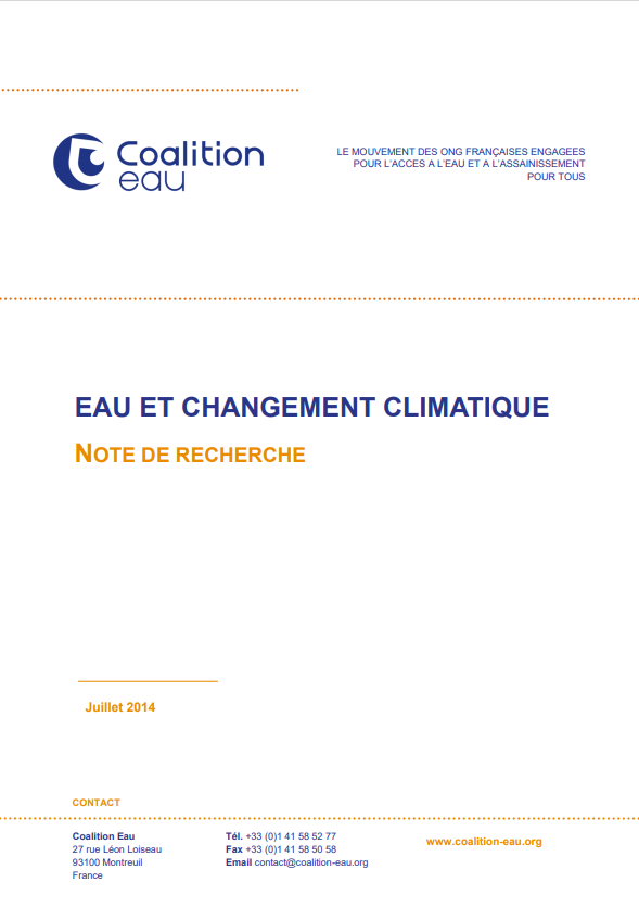 Jul 2014 ; 60 pages Ed. Coalition Eau - Nogent sur Marne Téléchargeable sous format: PdF ![]() Résumé: A l’aube de la mise en place d’un nouveau cadre de développement post-2015 et de la définition d’Objectifs du Développement Durable (ODD), et face aux enjeux internationaux actuels, la question du climat est de plus en plus prégnante au niveau international. C’est aussi un enjeu fondamental pour la France qui en a fait un axe d’intervention prioritaire de sa politique de développement et qui accueillera en 2015 la Conférence des Parties (COP) signataires de la Convention Cadre des Nations Unies sur les Changements Climatiques (CCNUCC). Alors que les thématiques de l’eau et du changement climatique sont fortement liées, un travail de recherche et de réflexion sur la question « Eau et Climat » a été engagé au sein de la Coalition Eau. Cette étude propose ainsi de : - Dégager et analyser les principaux enjeux de la relation entre eau et climat ; - Fournir un aperçu du paysage institutionnel autour de ces enjeux ; - Dresser un panorama des acteurs de la société civile impliqués dans ces thématiques. Sommaire: PARTIE 1 : L’eau au cœur du changement climatique 1. Le fonctionnement du changement climatique 2. Les différents scénarios de réchauffement climatique selon le GIEC 3. Les impacts du changement climatique sur le cycle de l’eau 4. Les répercussions socio-économiques du changement climatique sur le cycle de l’eau PARTIE 2 : Comment lutter contre le changement climatique ? 1. L’atténuation 2. L’adaptation PARTIE 3 : Les négociations climatiques et le financement 30 1. Le changement climatique dans le système international 2. Le fonctionnement des négociations climatiques 3. L’enjeu des financements climat 4. Les mécanismes de financement de la lutte contre le changement climatique 5 Les difficultés d’accès au financement PARTIE 4 : Panorama des acteurs société civile et de leur positionnement 1. Les réseaux « globaux » 2. Les réseaux et ONG « Eau et Climat »