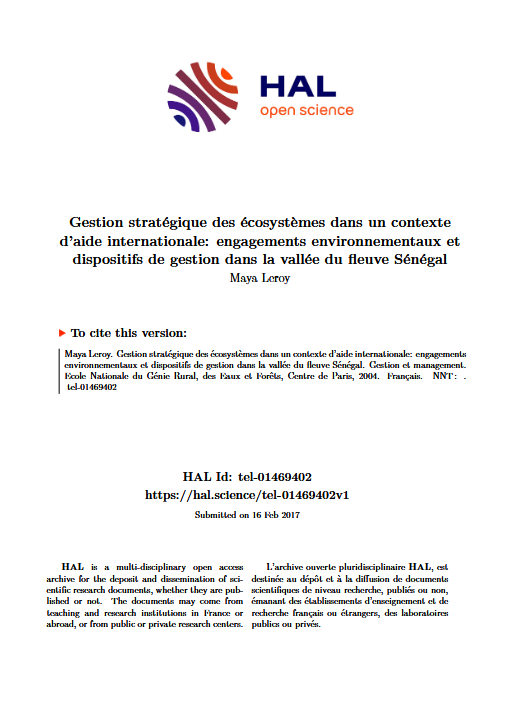 Engagements environnementaux et dispositifs de gestion dans la vallée du fleuve Sénégal thèse Sep 2004 ; 641 pages ![]() Ed. AgroParisTech - Paris Téléchargeable sous format: PdF ![]() Résumé: Face à l’annonce d’engagements internationaux visant à résoudre les problèmes d’environnement au nom d’un principe de responsabilité commun, observe-t-on l’organisation de cette prise en charge ? Et sinon, qui peut agir, et comment, pour que cela s’organise ? Il s’agit de comprendre comment nos sociétés s’y prennent pour relever le défi de l’environnement, dans l’état qu’entretiennent aujourd’hui nos cultures entre humains et non-humains. Quelles sont les rationalisations, par les sciences et les techniques, que les acteurs produisent ? Quels sont les dispositifs de gestion qu’ils construisent pour assurer cette prise en charge de l’état des milieux naturels ? Et y parviennent-ils au regard des référentiels qu’ils se sont fixés ? Au départ, il s'agissait de clarifier deux questions immédiates : - A partir de quand peut-on parler d’engagements de l’aide internationale vis-à-vis des problèmes d’environnement de la vallée du fleuve Sénégal ? - Quelles informations doit-on mobiliser pour avoir une idée de l’état des écosystèmes et de leur évolution ? Notre posture face au terrain, la nature de la recherche-intervention dans un cadre d’analyse stratégique de gestion de l'environnement, les choix que nous avons opérés, nous ont renvoyée à des questions théoriques, que nous discuterons dans la première partie de la thèse. Dans la deuxième partie, nous étudierons, à l'échelle du temps court de la stratégie, une situation de gestion de l'environnement : la gestion écologique de la vallée du fleuve Sénégal. Dans une première section, nous montrerons comment se structurent les dispositifs de gestion de l'environnement au niveau international, ce qui nous permettra de comprendre sur quelle base s'est construit le référentiel normatif de gestion écologique des fleuves qui fonde notre analyse, puis de faire une incursion sur la scène de l'écopolitique internationale pour en souligner les dynamiques et pour préciser les instruments de l'aide internationale qui soutiennent les politiques publiques d'environnement et de développement durable. Dans une deuxième section, nous montrerons comment nous avons construit un cadre d'analyse et d'évaluation pour la vallée du fleuve Sénégal. Dans la troisième section nous évaluerons les dispositifs de gestion, un dispositif régional inter-Etats qui annonce une gestion intégrée des ressources en eau du fleuve, et plusieurs dispositifs de gestion nationaux, en rive gauche, qui annoncent une gestion de l'environnement et des ressources naturelles. Nous conclurons en montrant comment notre cadre d'analyse et d'évaluation permet de rendre compte des responsabilités environnementales des dispositifs étudiés. La troisième partie permet, par une rétrospective sur le long terme, de comprendre la mise en place du système actuel, de comparer les processus, de saisir les évolutions et les facteurs répétitifs bloquant la mise en œuvre effective d’un traitement des problèmes d’environnement. La conclusion reviendra sur les acquis théoriques et méthodologique et soulignera les enjeux d'une lecture critique rendant lisible les responsabilités environnementales. -thèse de Maya Leroy-