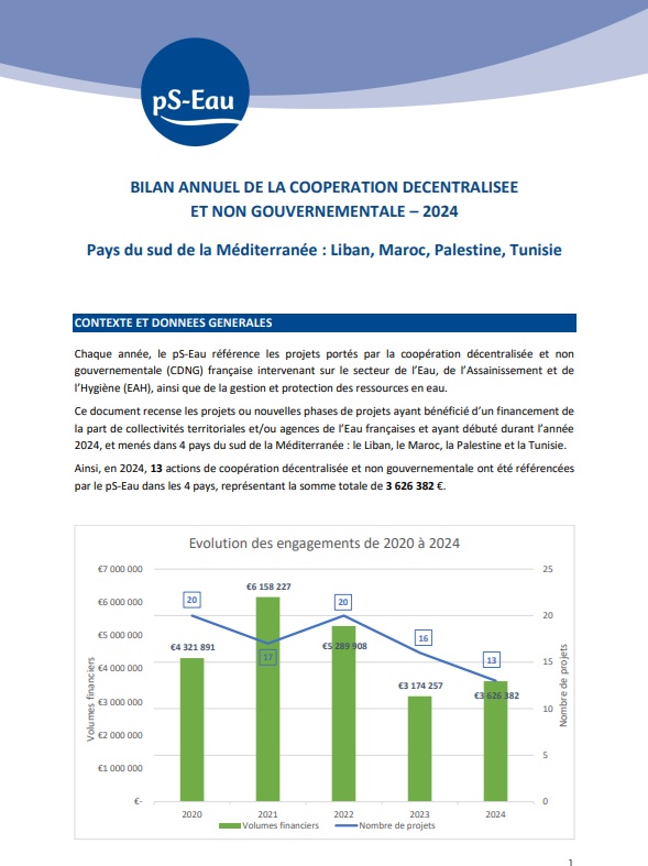 note Oct 2025 ; 9 pages ![]() Ed. pS-Eau - Paris Téléchargeable sous format: PdF ![]() Résumé: Chaque année le pS-Eau référence les projets portés par la coopération décentralisée et non gouvernementale française intervenant sur le secteur de l’Eau, de l’Assainissement et de l’Hygiène. Ce document recense les projets ou nouvelles phases de projets dans les Pays du pourtour Méditerranéen (Maroc, Tunisie, Palestine et Liban) ayant bénéficié d’un financement de la part de collectivités territoriales et agences de l’Eau françaises et ayant débuté durant l’année 2024. Public-Cible:
