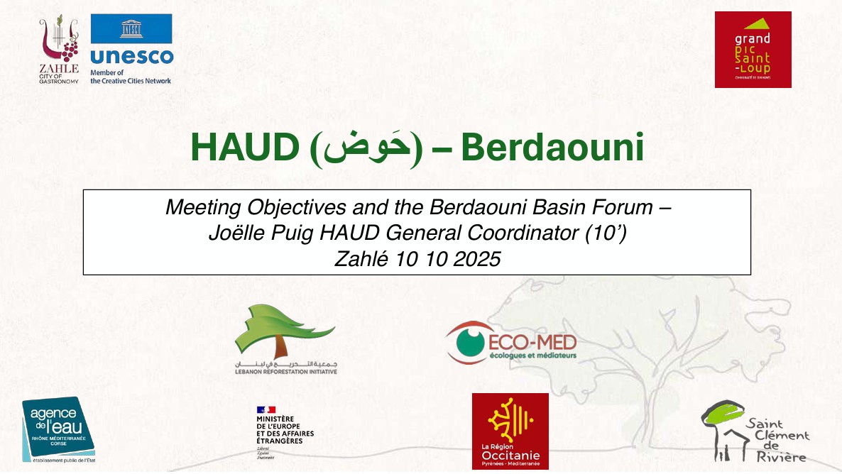Launching of the project diaporama powerpoint Oct 2025 ; 12 pages Ed. Grand Pic Saint Loup - Saint-Mathieu-de-Tréviers Téléchargeable sous format: PdF Abstract: The purpose of the « HAUD » project is to protect the endangered natural water system in the Berdaouni River Bassin (BRB). The methodology is to combine : 1) technical actions that bring results locally and 2) governance actions in order to make it possible at the BRB scale 3) knowledge actions Public-Cible: