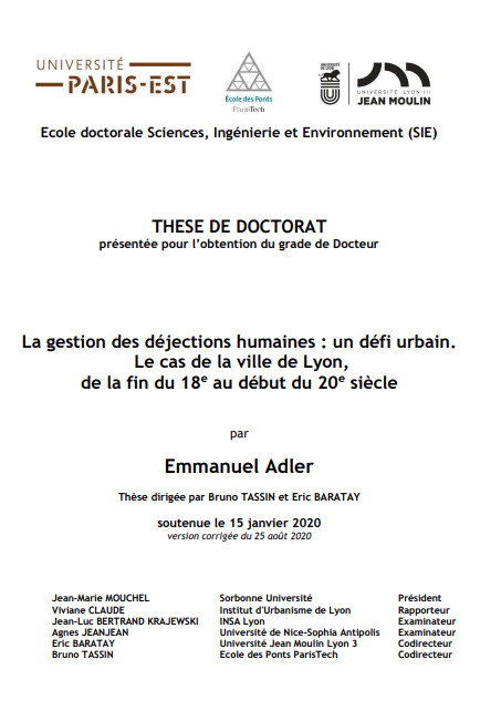 thesis Aug 2020 ; 348 pages Aut. Emmanuel Adler Ed. Université Paris-Est Sup - Marne-la-Vallée Downloadable format: PdF Downloadable from the publisher Résumé: Inspirée par l’exercice d’une longue activité professionnelle dans le domaine de l’assainissement, et plus particulièrement dans l’épuration des eaux usées domestiques, cette thèse a pour objet d’apporter un éclairage sur les conditions de gestion des déjections humaines dans une double réflexion technique et historique. La problématique étudiée porte sur les conditions d’évolution des systèmes d’assainissement des villes développés par les êtres humains pour gérer leurs matières excrémentielles et les soustraire à leur environnement immédiat. Il s’agit d’étudier plus précisément les moyens adoptés pour procéder à l’éloignement des déjections humaines. Le sujet est appréhendé depuis les premiers équipements destinés à recueillir les matières solides et liquides, en passant par les conduites et les fosses de stockage, jusqu’aux opérations logistiques d’extraction, de déplacement et de transformation, pour conclure sur la victoire du tout-à-l’égout. Soulevant le voile sur la part de secret qui caractérise tout ce qui touche aux déjections humaines, ce travail tente d’apporter un éclairage nouveau sur ce secteur d’importance, en particulier dans un contexte d’économie circulaire et de transition énergétique. Sur l’échelle de temps d’une part, si la période retenue pour orienter les investigations conduites est relativement longue, couvrant la fin du XVIIIe jusqu’au début du XXe s., c’est parce qu’elle permet d’appréhender l’essor d’une activité aux multiples connexions (techniques, scientifiques, politique publique, justice…). Cet intervalle caractérise une radicale transformation des activités de gestion des déjections humaines produites par les habitants des grandes villes. Dans une progression rythmée par des tensions et des crises, le système d’évacuation des déjections humaines de la cité se structure en réseau, contrôlé par un nombre croissant d’acteurs, mais également de procédés techniques, de règlementations, et bien sûr pour en assurer le fonctionnement, de mécanismes financiers. Second point déterminant d’autre part, après l’ancrage chronologique et dans le contexte très centralisateur de la France, la recherche porte géographiquement un intérêt marqué pour la ville de Lyon, qui bénéfice d’un contexte particulier par rapport à Paris, avec la présence du Rhône, et qui est restée jusqu’ici relativement peu considérée sous l’angle des déjections humaines. Pour rendre digeste un sujet caractérisé par la profusion de données et la diversité de systèmes, hier et aujourd’hui, un découpage parmi d’autres a été adopté. Après l’analyse des enjeux techniques, puis des aspects liés à la santé, la thèse aborde les aspects juridiques et financiers de la gestion des matières. A la suite, motivé par une formation d’ingénieur agronome, le travail se poursuit avec la question du devenir des déjections, et plus précisément leurs conditions de retour au sol. La conclusion cherche à mettre en évidence que les conditions d’éloignement des déjections humaines en milieu urbain se complexifient au fil du temps, avec la mise en œuvre d’opérations supplémentaires de séparation de phases, et la victoire du tout-à-l’égout au XXe siècle.