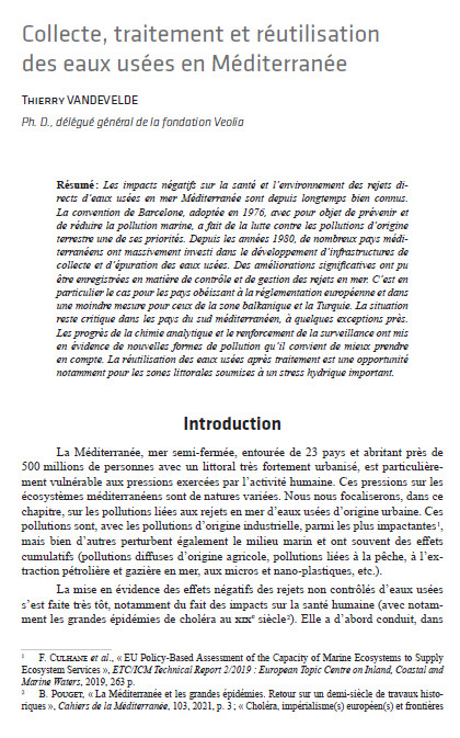 article Mar 2024 ; 10 pages Aut. Thierry Vandevelde Ed. AMU - Marseille Downloadable format: PdF Résumé: Les impacts négatifs sur la santé et l’environnement des rejets directs d’eaux usées en mer Méditerranée sont depuis longtemps bien connus. La convention de Barcelone, adoptée en 1976, avec pour objet de prévenir et de réduire la pollution marine, a fait de la lutte contre les pollutions d’origine terrestre une de ses priorités. Depuis les années 1980, de nombreux pays méditerranéens ont massivement investi dans le développement d’infrastructures de collecte et d’épuration des eaux usées. Des améliorations significatives ont pu être enregistrées en matière de contrôle et de gestion des rejets en mer. C’est en particulier le cas pour les pays obéissant à la réglementation européenne et dans une moindre mesure pour ceux de la zone balkanique et la Turquie. La situation reste critique dans les pays du sud méditerranéen, à quelques exceptions près. Les progrès de la chimie analytique et le renforcement de la surveillance ont mis en évidence de nouvelles formes de pollution qu’il convient de mieux prendre en compte. La réutilisation des eaux usées après traitement est une opportunité notamment pour les zones littorales soumises à un stress hydrique important.