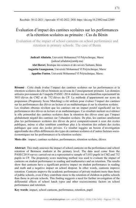 Évaluation d'impact des cantines scolaires sur les performances et la rétention scolaire au primaire : Cas du Bénin | ||||||||