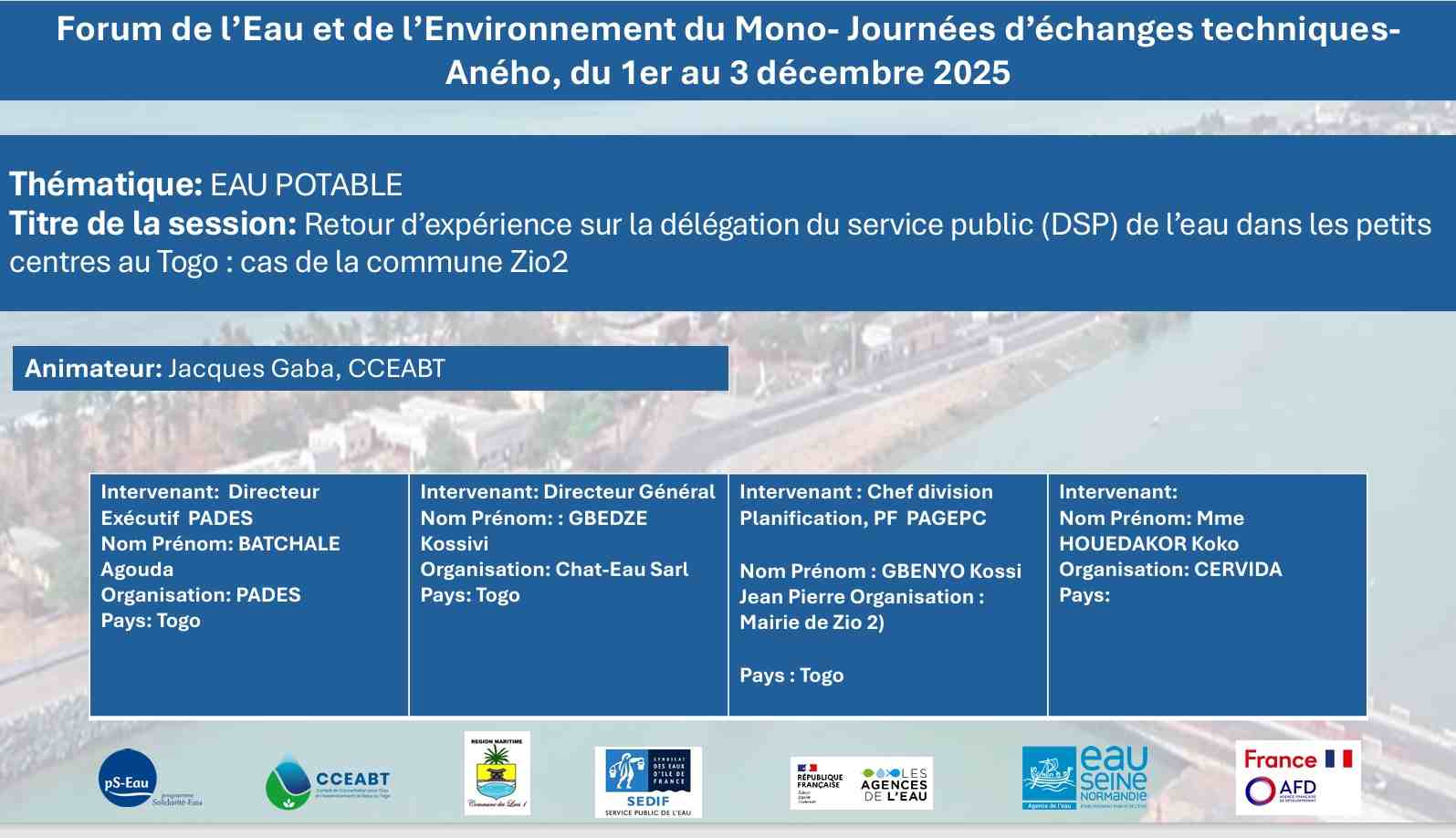 slide show powerpoint Jan 2025 ; 55 páginas Ed. CERViDA - Lomé Commune de Zio 2 - Zio 2 PADIE - Lomé agoe-nyivé 3 PADES - Thcitchao pS-Eau - Paris Formato descargable: PdF Résumé: DSP unitaire appliqué à un service d’eau potable à l’échelle communale, retours d'expérience au Togo dans les communes de Zio 2 et Tchitchao Destino Audiencia: