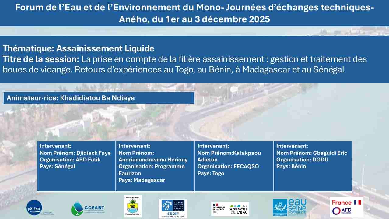 slide show powerpoint Dec 2025 ; 56 páginas Ed. ARD - Fatick DGDU - Cotonou FECAQSO - Sokodé Programme EAURIZON 2028 - Fianarantsoa pS-Eau - Paris Formato descargable: PdF Résumé: En Afrique subsaharienne, seuls 24% des personnes ont accès à des services d’assainissement gérés en toute sécurité et 17% de la population pratiquent toujours la défécation à l’air libre (Rapport du Joint Monitoring Program 2023, OMS/UNICEF). Cette situation est contrastée entre le milieu urbain, mieux équipé, et le milieu rural qui souffre d’une plus grande carence d’infrastructures. En outre, on estime que plus de 65 % des habitations disposant de systèmes d’assainissement sont équipées d’installations autonomes (latrines et éventuellement fosses septiques) non raccordées à un réseau d’égout. Lorsque les fosses sont pleines, elles sont soit abandonnées, soit leur contenu est évacué par des vidangeurs manuels, plus rarement par des camions de vidange, bien souvent sans traitements préalables dans des lieux non appropriés. L’essentiel des actions se concentrent sur la construction d’équipements visant l’atteinte de « Fin de Défécation à l’Air Libre » (FDAL), sans prendre suffisamment en compte la gestion des boues de vidange issues des fosses, qui reste le parent pauvre du secteur. Le manque de moyens (techniques, financiers et humains), de planification et de prise en compte par les autorités des services de vidange mécaniques et manuels, pourtant indispensables pour améliorer les conditions de vie des populations, expose l’ensemble de la population à des risques sanitaires et environnementaux conséquents. L'universalisation de l'accès aux toilettes est un objectif crucial pour garantir la dignité humaine, la santé publique et la protection environnementale. Cependant, ce défi est complexe car il implique d’être en mesure de cibler efficacement les besoins des bénéficiaires, de choisir des méthodes de sensibilisation efficaces et de promouvoir les options techniques adaptées aux différents contextes en prenant en compte la possibilité pour les ménages les plus vulnérables d’accéder à des financements. Cette session a pour objectif de mettre en lumière les enjeux, les défis et les bonnes pratiques liés à la gestion des boues de vidange dans les systèmes d’assainissement autonome, et partager les retours d’expérience de trois pays africains. Destino Audiencia: