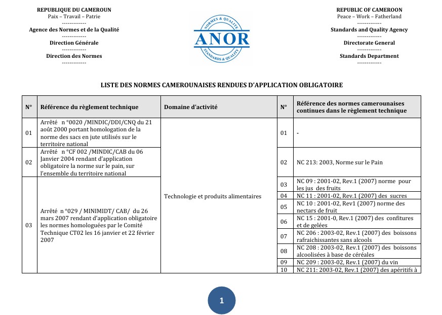 Liste des normes Camerounaise rendues application obligatoire