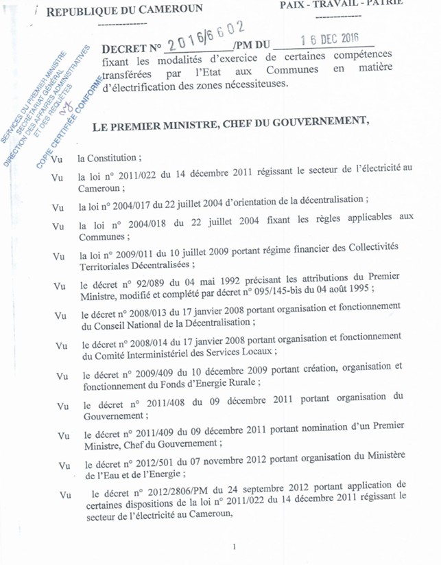 Décret N° 2016/6602/PM du 16 Décembre 2016 fixant les modalités d’exercice de certaines compétences transférées par l’Etat aux communes en matière d’électrification des zones nécessiteuses