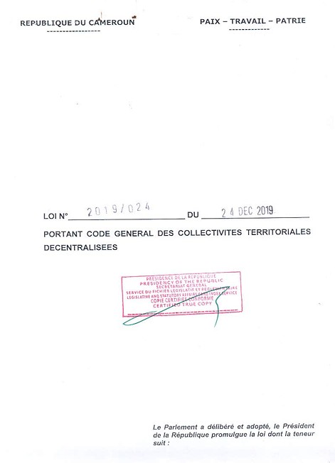 Loi N° 2019/024 du 24 Dec 2019 portant code général des collectivités territoriales décentralisées