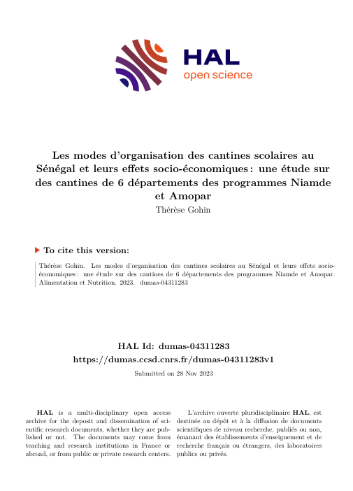 Les modes d'organisation des cantines scolaires au Sénégal et leurs effets socio-économiques: une étude sur des cantines de 6 départements des programmes Niamde et Amopar