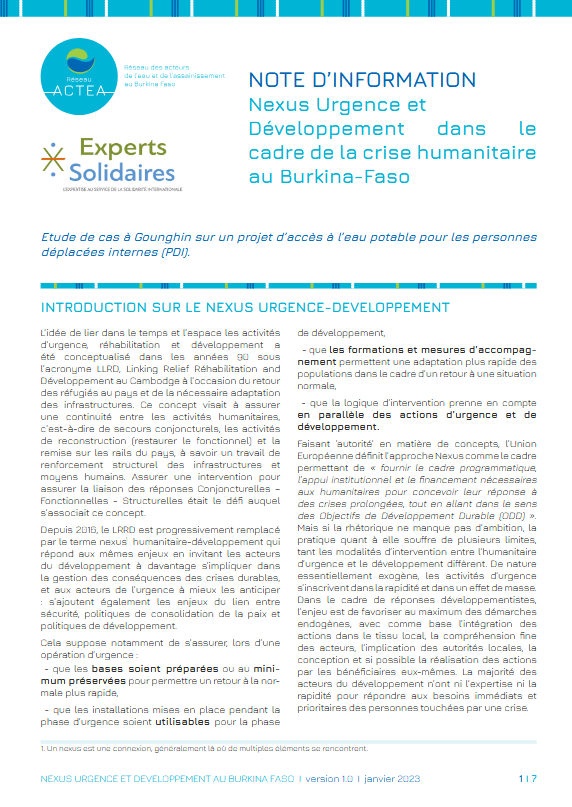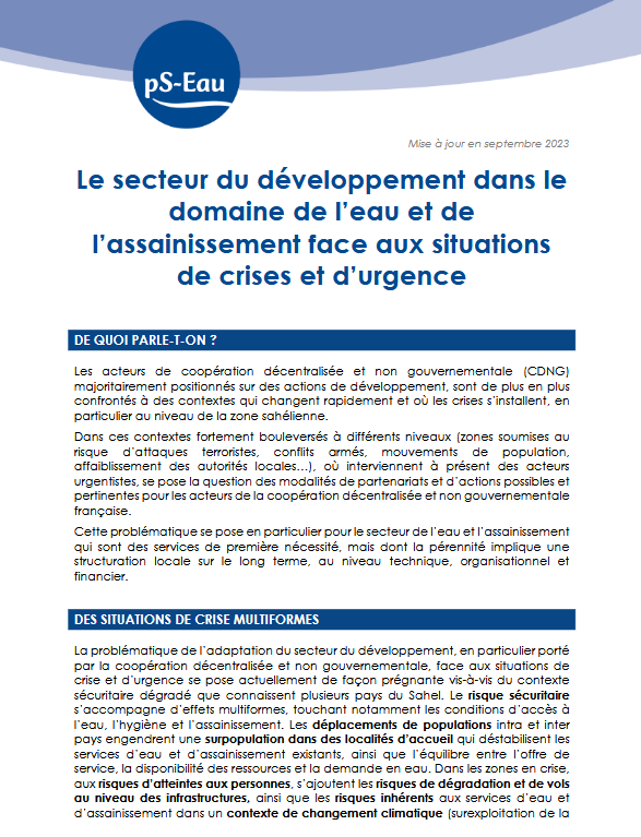 Pour tenter d’apporter des éléments de réponse à ces enjeux, le pS-Eau s’est donné pour objectif de créer des liens entre acteurs urgentistes et de développement, que cela soit en France, ou au niveau des plateformes pays de l’association. Pour cela le pS-Eau participe tous les trimestres au groupe de travail « Crises et Fragilités » du Partenariat Français pour l’Eau, et anime des ateliers d’échanges en région ou au niveau des plateformes.